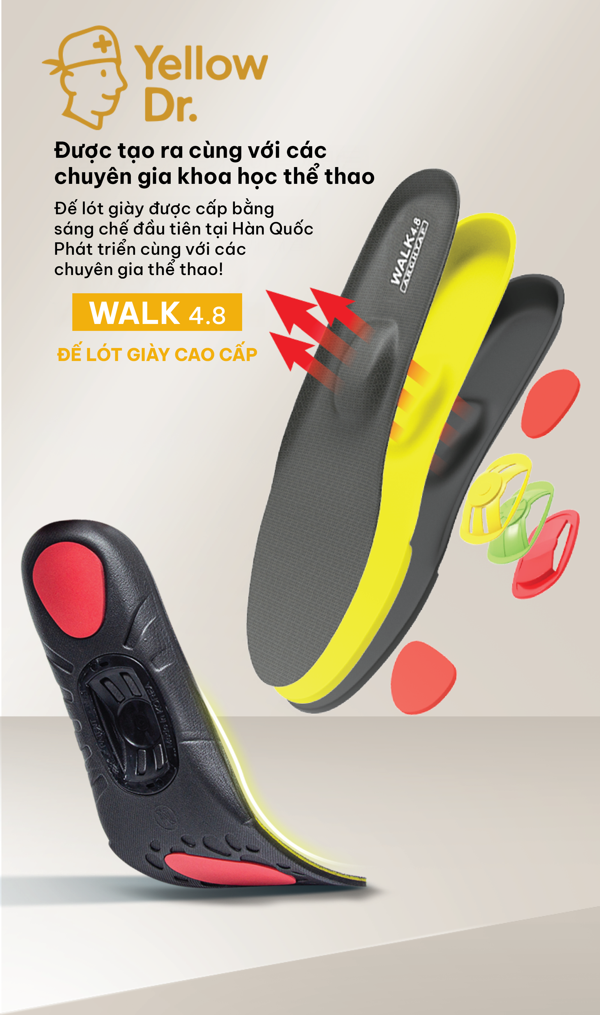 Trải nghiệm những bước đi thoải mái cùng miếng lót giày Yellow Dr. Walk 4.8 – miếng lót giày chức năng duy nhất trên thế giới có tính năng massage chân tự động. Phiên bản Upgrade được trang bị thêm bộ nút archtap rời, giúp điều chỉnh độ cao linh hoạt đến 4 cấp độ so với phiên bản Walk 4.8 (Basic)